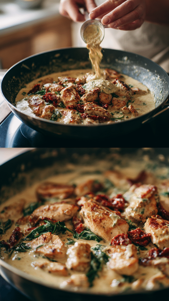 Next, let’s talk about searing the chicken. In a sturdy 12-inch skillet, melt some rich, unsalted butter over medium-high heat. Add minced garlic and let it sauté until it’s just fragrant—it’s a heavenly aroma that fills the kitchen. If you’re using sundried tomatoes, now’s the time to toss them in for an extra layer of flavor. Sear the chicken for about 3 to 4 minutes on each side until it’s beautifully browned. This step locks in the juices and gives that golden exterior we all love.